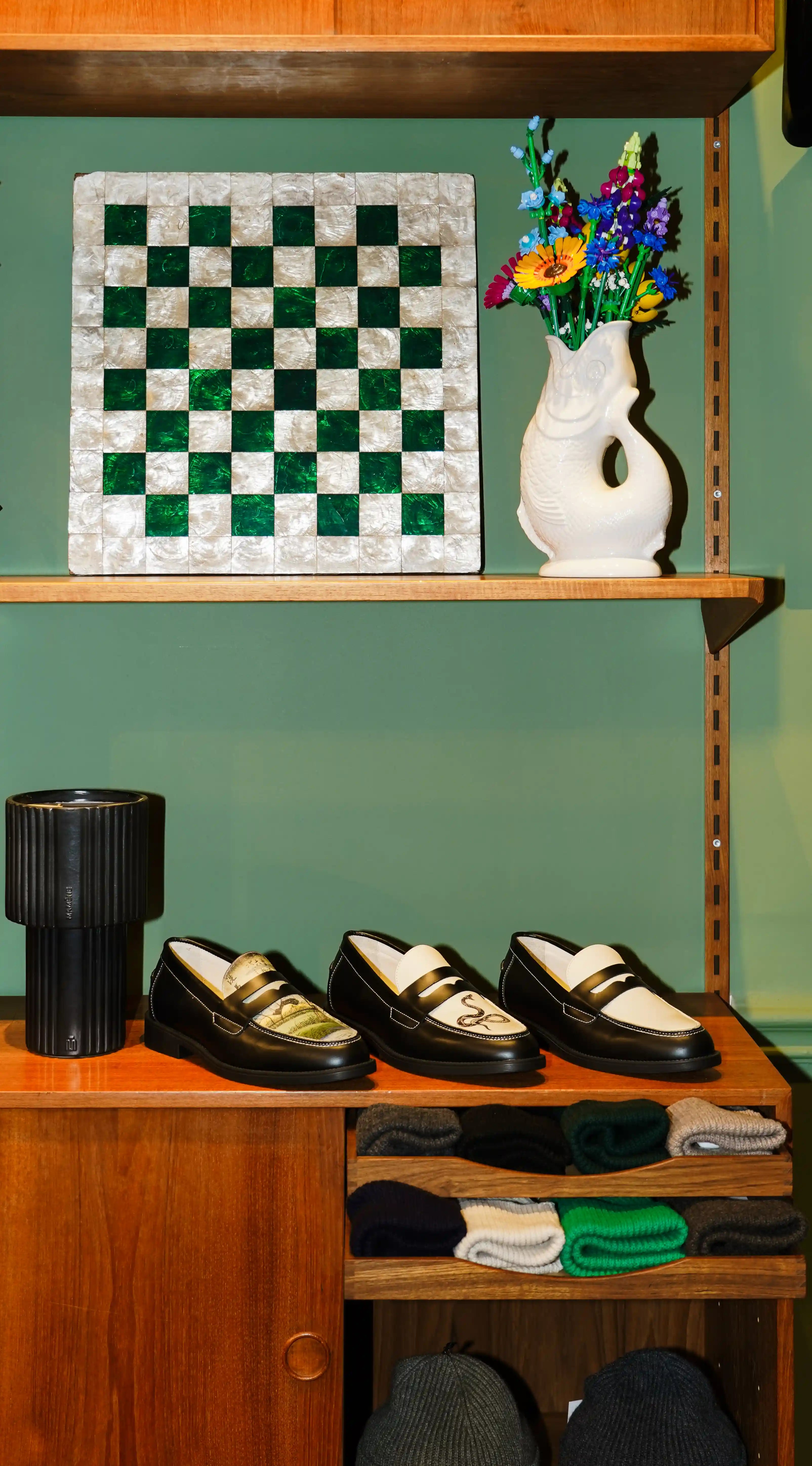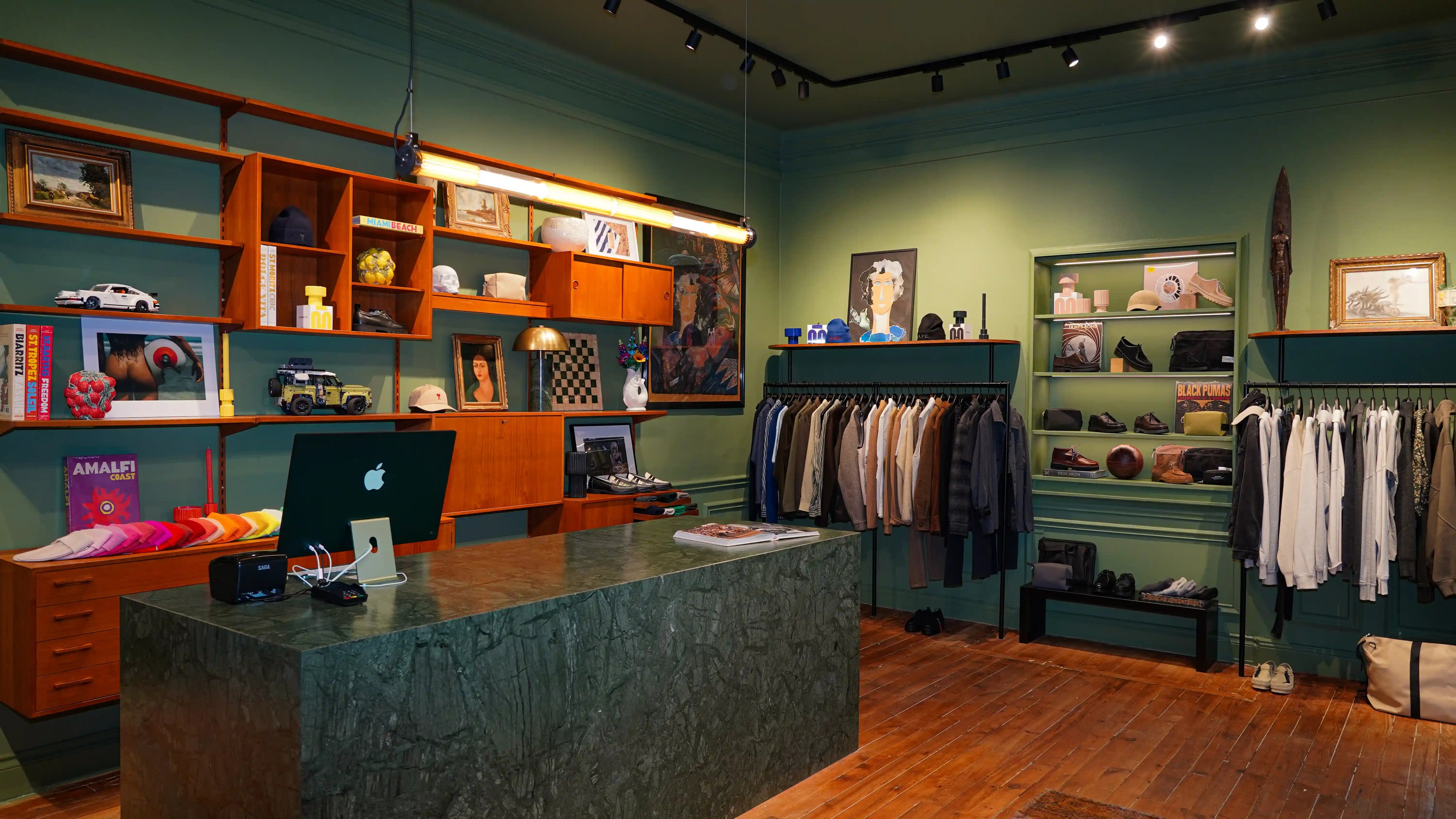 MONSIEUR, MADAME. , une boutique au charme londonien, plongée dans des nuances de vert qui créent une ambiance originale. Chaque détail de la décoration a été pensé pour offrir un univers unique, où le style s’exprime avec caractère et modernité.